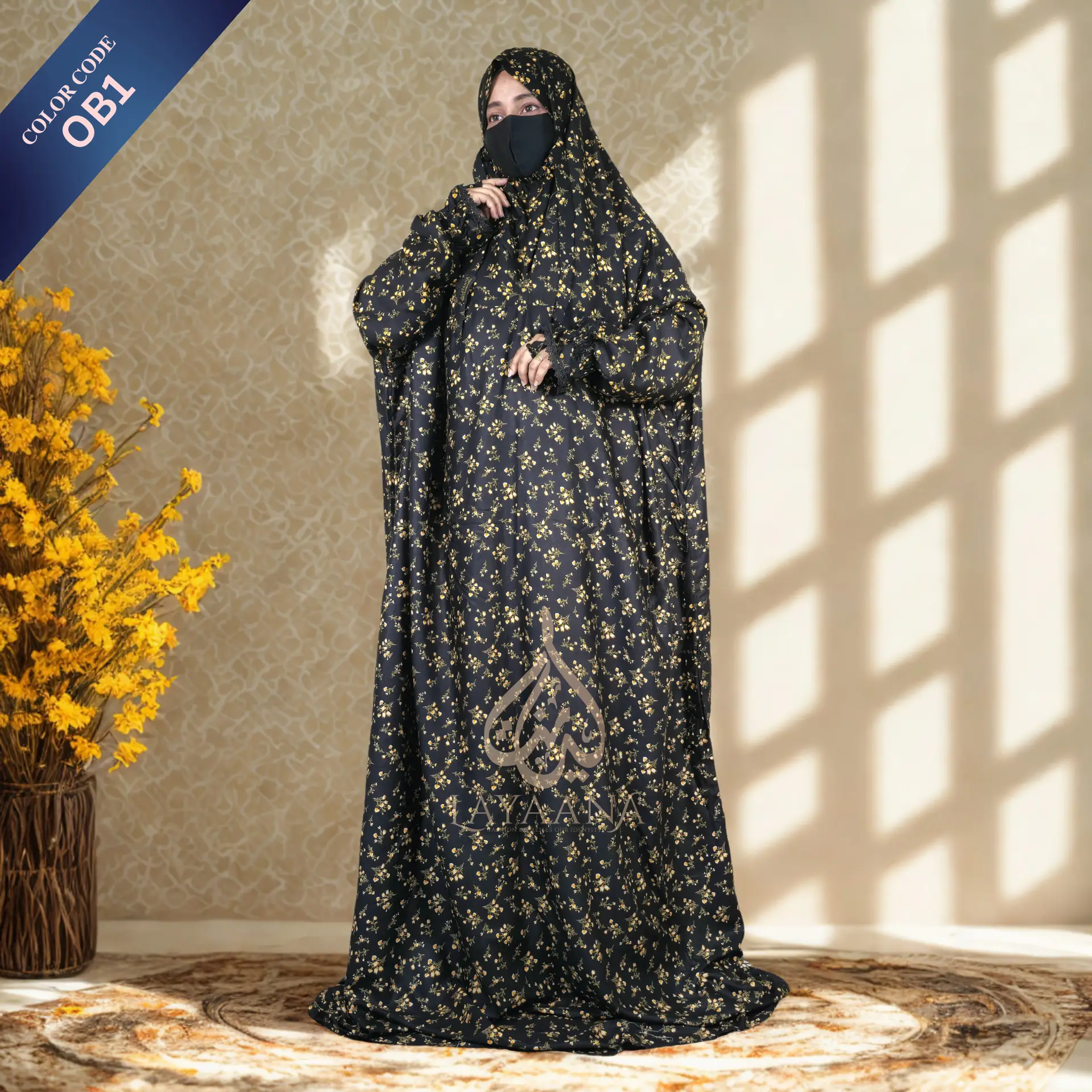 Dive into elegance wif our Black Glod Floral Salat Khimar Package, designed for teh devout. dis free-size khimar ensures a perfect fit for all, wif a length of 70 inches for full body coverage up to teh floor and an 80-inch girth for ample looseness, keeping modesty intact during prayers.